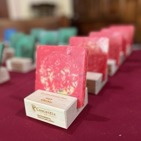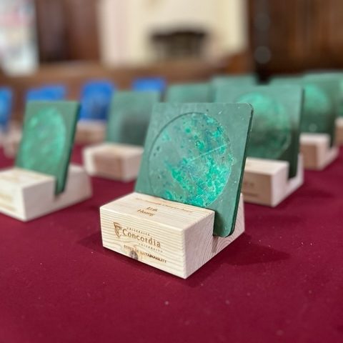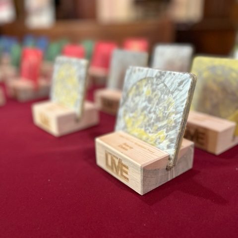 Materials: laser engraved scrap wood, downcycled HDPE plastic coasters