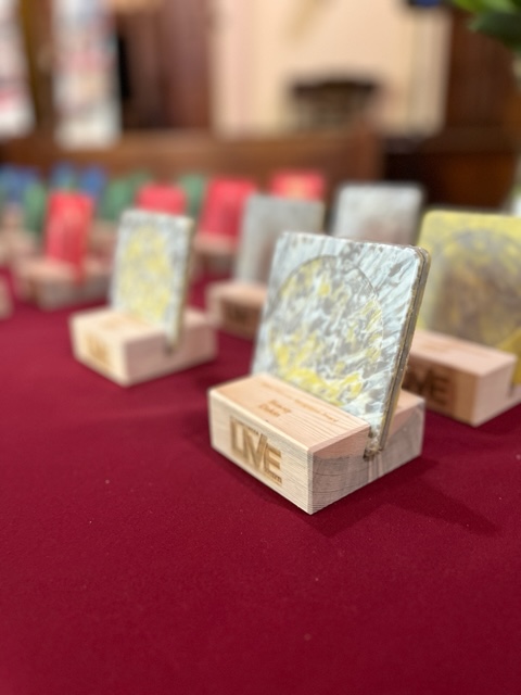 Materials: laser engraved scrap wood, downcycled HDPE plastic coasters