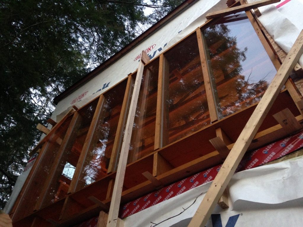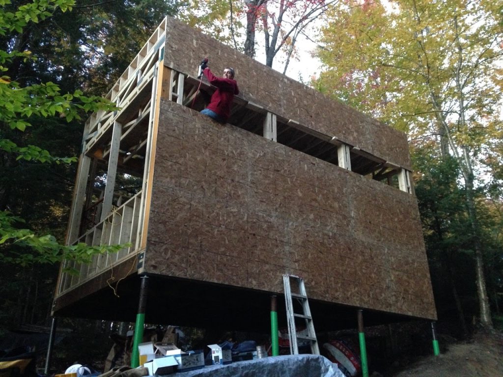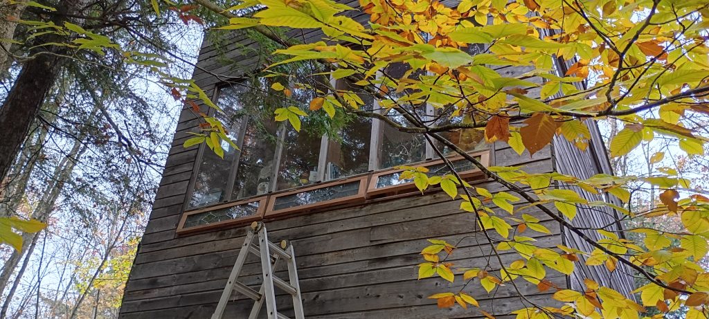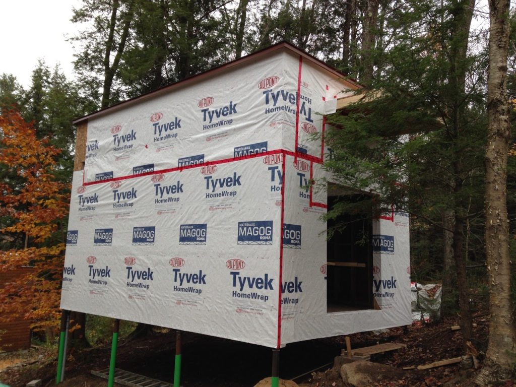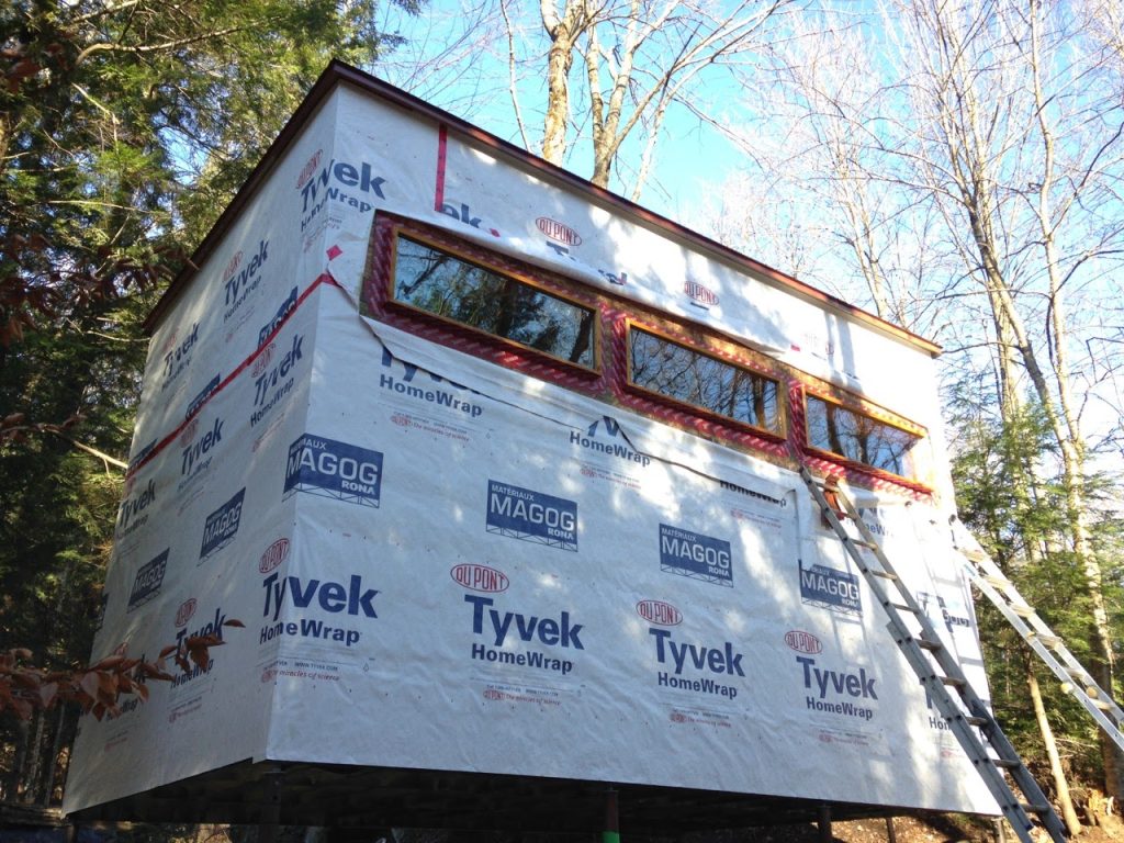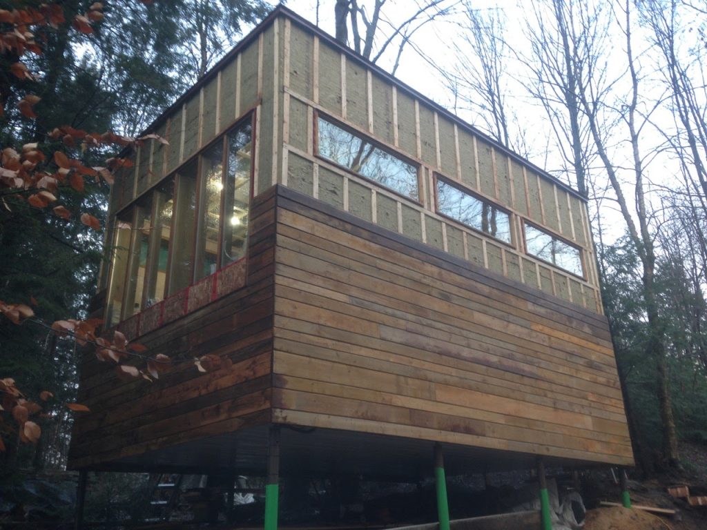 New and reclaimed barn wood, LVL (laminated timber beams and posts), metal, upcycled windows, soy-based polyurethane spray insulation, rock fiber insulation (Rockwool), Tyvek HouseWrap