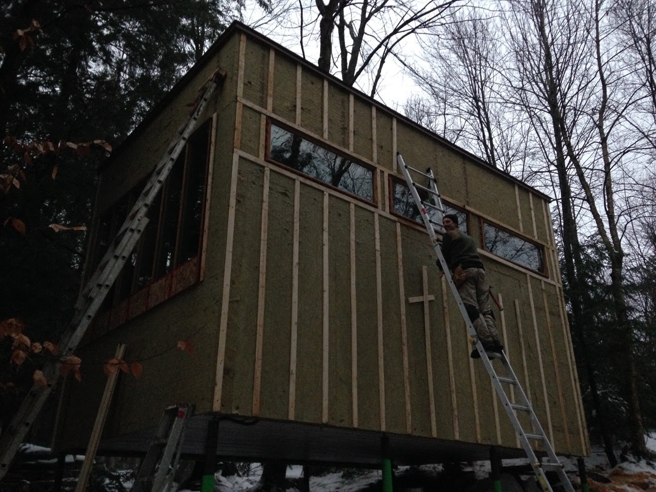 New and reclaimed barn wood, LVL (laminated timber beams and posts), metal, upcycled windows, soy-based polyurethane spray insulation, rock fiber insulation (Rockwool), Tyvek HouseWrap