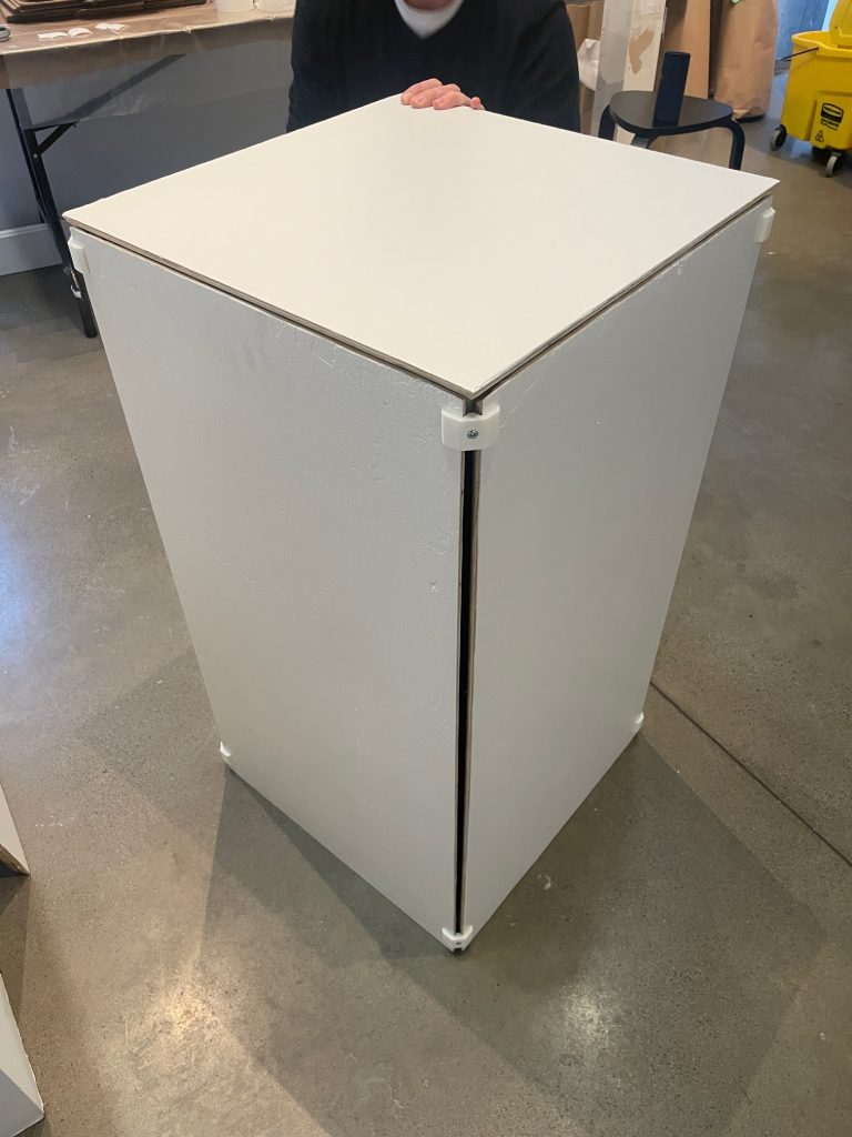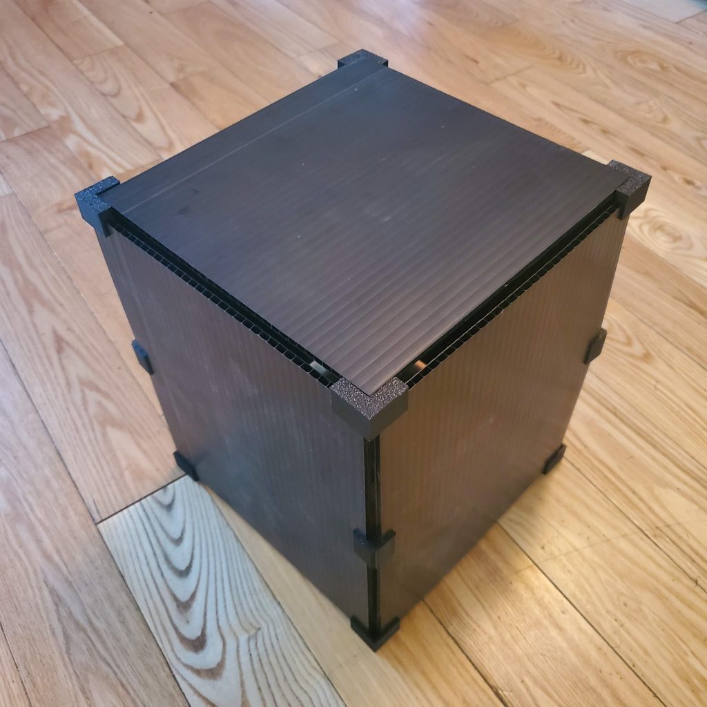 reclaimed coroplast (corrugated plastic), 3D printed PLA corners